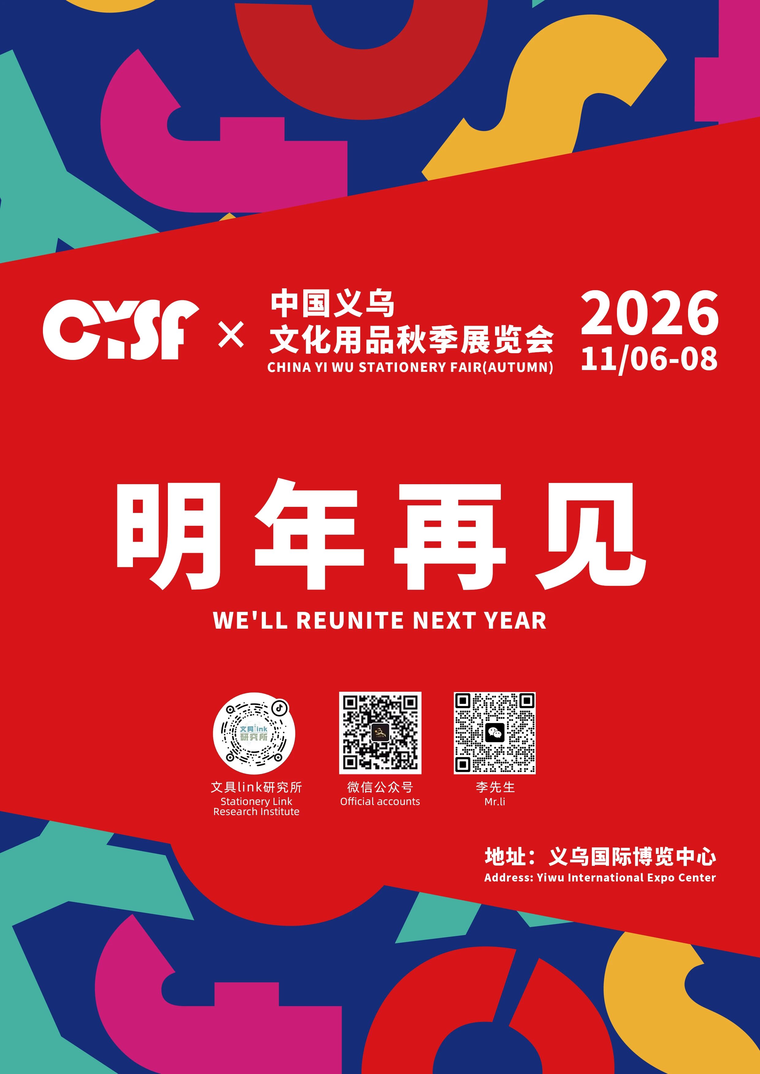展会的圆满成功,离不开各级政府部门的悉心指导与合作伙伴的鼎力支持,由衷感谢每一位文具界同仁的热情参与和精彩呈现。正是大家的智慧与热忱,共同绘就了这场行业盛会的精彩画卷。2026年11月6日至8日,中国义乌文化用品秋季展览会将重启E馆,聚焦全球客商。我们将持续提升服务水平与福利政策,期待您的再次莅临,携手开启文具行业新篇章。